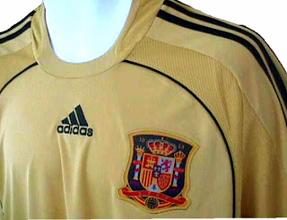 evia al partido ante Suecia, junto a la nueva primera equipación son muy taurinos. Oro y azabache. Como pueden apreciar en las fotos (sacadas de este enlace por una fuente cibernauta fidedigna, en el que también se puede encontrar la nueva camiseta de Adidas de Argentina), la segunda equipación de España será en oro, si se quiere ver así, porque también podría decirse que es amarilla (color que escama, que da, como él